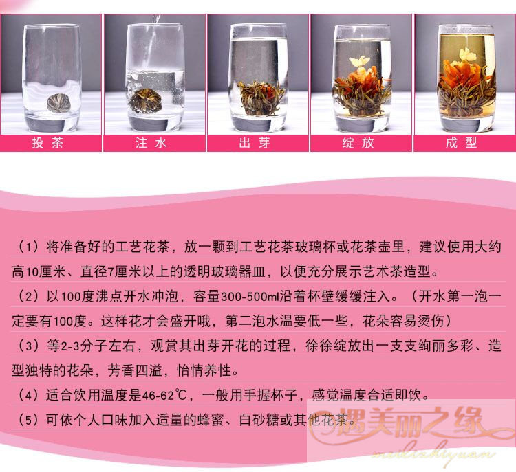 *****Chinese Artistic Teas, which are also called Blooming Teas, Artificial Teas or Artistic Teas, are all made by hand with the most complicated technology. It is a newly-innovated special green tea, which features unique appearance, splendid infusion view, lingering flower scent mixed with tea flavor and various health benefits such as delaying the ageing of cells, whitening the skins, improving immunity, etc. The tea is made of the highest grade special green tea of fresh spring crops and natural herbal flowers.